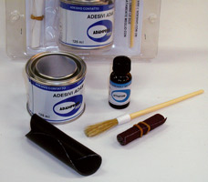 Praktisches und komplettes Reparatur-Set für Schlauchboote. Bestehend aus Klebestoff und entsprechendem Härter, Pinsel zum Aufstreichen und Flicken in diversen Farben.